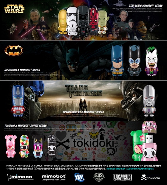 미모코와의 파트너쉽 체결을 통해 미모봇 특유의 디자인으로 만나볼 수 있는 미모봇 캐릭터 USB 제품으로는 스타워즈 시리즈의 유명 주인공인 다스베이더, 요다, 스톰트루퍼가 있으며, 국내에는 슈퍼맨, 배트맨으로 잘 알려진 DC코믹스의 주인공들, 얼마 전 영화화 되면서 큰 인기에 편승해 여러 편의 시리즈가 제작된 트랜스포머, 연령대에 관계 없이 전 세계 수많은 골수 여성팬을 보유한 헬로키티 등이 있다.