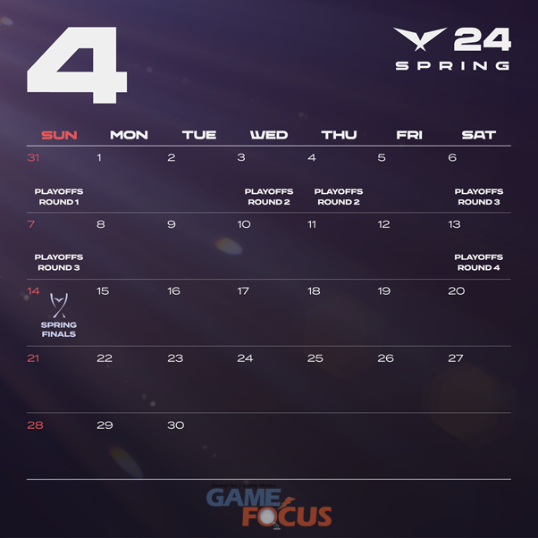 정규 시즌은 3월 24일까지 진행되며 리그 1위부터 6위에 오른 팀들이 참가하는 플레이오프는 3월 30일부터 더블 엘리미네이션 방식으로 치러진다. 플레이오프 일정은 지난해 스프링 시즌과 달리 라운드 간 간격을 좁혀 1주 차에 1라운드(토, 일), 2주 차에 2라운드 및 3라운드(수, 목, 토, 일)그리고 3주차에 최종 결승 진출전과 결승전이 진행된다. 결승전은 4월 14일 진행된다.