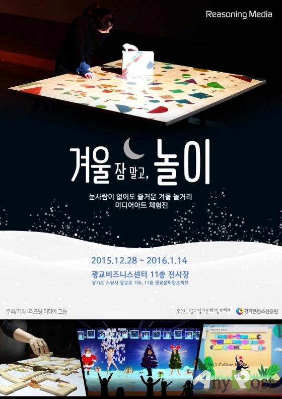 경기도(도지사 남경필)와 경기콘텐츠진흥원(원장 곽봉군)은 가족 대상 미디어 체험 전시회 '겨울 잠 말고, 놀이'를 오는 28일부터 1월 14일까지 수원시 '광교 경기문화창조허브'에서 개최한다고 밝혔다.