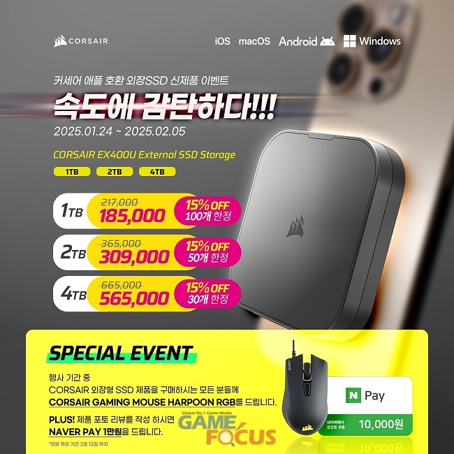 커세어는 애플 호환 ‘EX400U’ 출시를 기념해 1월 24일부터 오는 2월 4일까지 네이버 판매처를 통해 제품을 구입하면 1TB(100개), 2TB(50개), 4TB(30개)의 제품에 한해서만 15% 할인하는 단독 오픈 이벤트를 진행한다. 이벤트 기간동안 제품을 구매한 이들 모두에게 커세어 하푼 RGB 마우스를 증정하며 제품 구입 후 2월 12일까지 네이버 포토 리뷰를 작성하면 네이버 페이 1만원을 추가 증정하는 스페셜 이벤트도 열린다