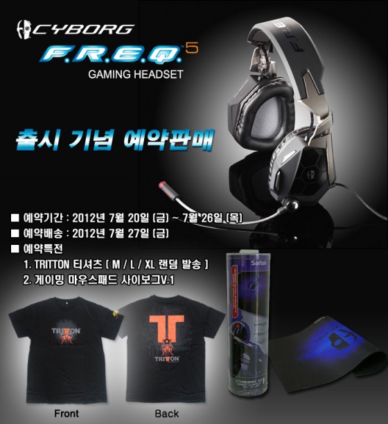 F.R.E.Q. 5 게이밍 헤드셋 제품의 예약 판매는 7월 20 일부터 지정 쇼핑몰(www.gamepara.com) 및 유명 온라인 쇼핑몰에서 실시되며 예약구매자 전원에게는 고급 티셔츠와 사이보그 V.1 게이밍 마우스 패드가 증정된다.