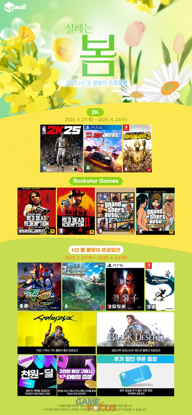 H2몰에서는 3월 27일(목)부터 4월 24일(목)까지 봄맞이 프로모션을 진행한다. 본 프로모션에서는 ‘울프팽/스컬팽 새턴 트리뷰트 부스티드’, ‘릴 피싱 데이즈 오브 서머’, ‘슬리터헤드(야구자)’, ‘디즈니 에픽 미키: 리브러쉬드’ 등을 포함한 수많은 신작과 인기 콘솔 게임 패키지 타이틀들을 만나볼 수 있으며, ‘사이버펑크 2077’, ‘검은사막 프레스티지 에디션’ 등의 한국어판 패키지 할인 프로모션도 동시에 진행된다. 또한, 행운의 천원 딜, 매주 금요일 추가되는 할인 쿠폰 증정, 3만원 이상 구매 시 PS4 랜덤 타이틀 증정 이벤트도 진행된다.
