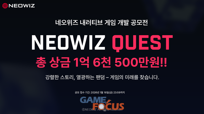 네오위즈가 개최중인 내러티브 인디게임 개발 공모전 '네오위즈 퀘스트'(NEOWIZ Quest)에 대한 관심이 뜨겁다. 2026년 1월 16일까지 약 1년의 모집 기간, 총 상금 1.65억원에 '내러티브 기반 게임'이라는 독특한 테마가 인디게임 개발자들의 흥미를 돋우는 것 같다.