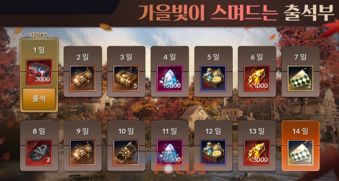 ‘가을빛이 스며드는 출석부’ 이벤트를 9월 30일 오전 09시까지 2주간 진행한다. 모험가들은 인게임 베너에서 ‘출석 버튼’을 눌러 매일 보상을 받을 수 있다. 접속 일차에 따라 ‘노을빛 행운 상점 10회권’과 ‘협동 토벌대 입장권’ 등 받는다.