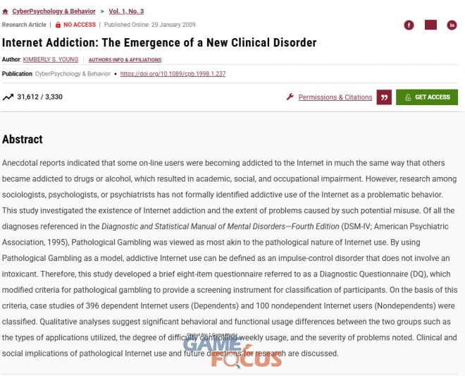 해당 논문은 ‘인터넷 사용 그 자체는 현실 생활에 심각한 기능적 문제를 일으킨다는 점에서 ‘장애’로 규정되며 그 원인을 ‘중독’이라는 행동적인 특성에서 찾았다’고 요약할 수 있다. 한 마디로 중독적인 인터넷 사용은 행동적인 장애를 불러일으키는 결과로 이어지게 된다는 것인데 이는 인터넷 과몰입을 ‘중독’의 범주로 끌어들이려는 시도라고 볼 수 있다.