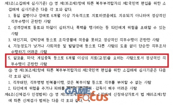 한때 게임중독을 포함시켜 지난해 논란이 되었던 병무청의 '공익근무요원 복무부적합자 소집해제 처리규정'과 관련해 병무청 역시 논란이 되자 '게임중독' 항목을 삭제한 바 있다