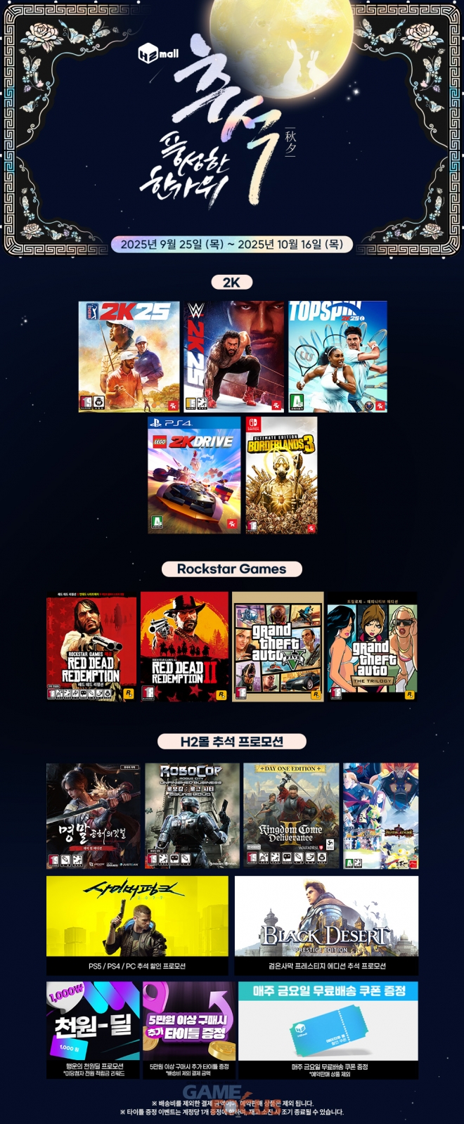 H2몰에서는 9월 25일(목)부터 10월 16일(목)까지 추석 할인 프로모션을 진행한다. 본 프로모션에서는 ‘명말: 공허의 깃털’, ‘로보캅: 로그 시티 – 언피니시드 비즈니스’, ‘킹덤 컴: 딜리버런스 II’, ‘팬텀 브레이브 + 팬텀 킹덤 컬렉션’를 포함한 수많은 신작과 인기 콘솔 게임 패키지 타이틀을 만나볼 수 있으며, ‘사이버펑크 2077’, ‘검은사막 프레스티지 에디션’ 등의 한국어판 패키지 할인 프로모션도 동시에 진행된다. 또한, 행운의 천원 딜, 5만원 이상 구매 시 PS4 랜덤 타이틀 증정, 매주 금요일 무료 배송 쿠폰 증정 혜택 등이 함께 진행된다.