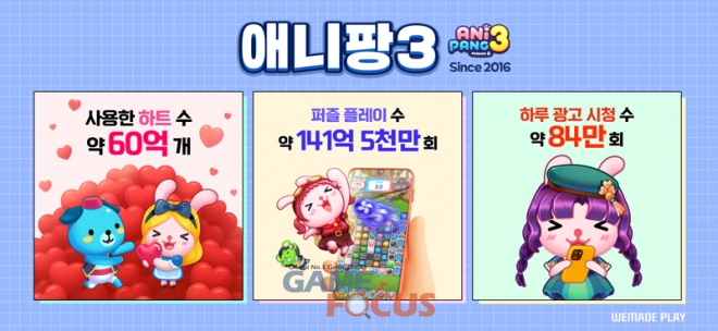 한편 애니팡 시리즈의 대표 아이콘인 하트는 ‘애니팡3’ 단일 버전에서 60억여 개가 사용된 것으로 집계됐다. 월 평균 5천만여 개가 사용된 ‘애니팡3’의 하트 사용 개수는 시즌1(1000개), 시즌2(3200개), 시즌3(5820개) 등 정규 퍼즐 스테이지 1만여 개와 이벤트 42종에서 사용된 것으로 분석됐다. 또한 하트 사용 없는 콘텐츠를 포함한 누적 퍼즐 플레이는 9년 간 142억여 건을 기록하며 ‘애니팡3’만의 탄탄한 이용층을 입증했다.