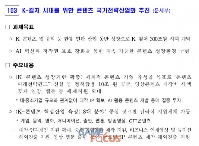 아울러 이재명 정부가 9월 공개한 123대 국정과제에 따르면, K-콘텐츠 중 게임, 음악, 영화, 애니메이션, 출판, 웹툰, 방송 영상 OTT 콘텐츠에 대한 지원을 확대하고 글로벌 IP 콘텐츠 제작 및 해외 진출을 지원할 예정이다.