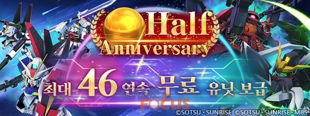 하프 애니버서리 이벤트로는 「Half Anniversary 로그인 보너스」, 「Half Anniversary 패널 미션」, 「기간 한정 캐릭터 리퀘스트」도 진행 중이다. 오늘부터는 전용 티켓을 모아 뽑기를 돌릴 수 있는 「Half Anniversary 최대 46연속 무료 뽑기」도 개최 중이며, 「강적 습격」 이벤트를 통해 「샤이닝 건담(슈퍼 모드)」과 「바이아란 커스텀 2호기」가 강적 유닛으로 새롭게 등장한다.
