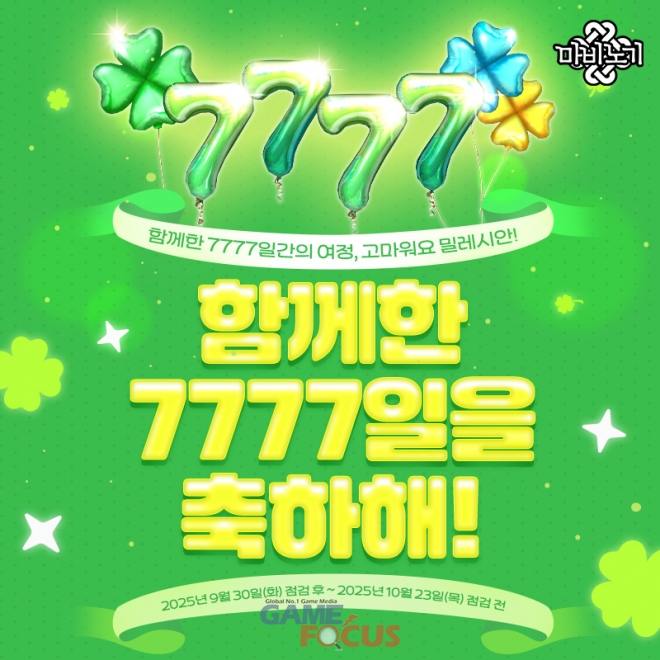 '마비노기'는 정식 서비스 7777일을 맞아 '함께한 7777일을 축하해!'와 함께 추석 이벤트를 진행한다. 10월 23일 점검 전까지 진행되는 7777일 기념 이벤트는 던바튼 광장의 'NPC 도미니크'를 통해 참여할 수 있으며, 일일·메인·스토리 퀘스트를 진행한 이용자에게 '빛나는 구슬', '네아르', '커피바 바리스타 의장' 등의 보상을 제공한다. 또한, 이용자에게 감사의 마음을 담은 특별 쿠폰을 선물하며, 5일부터 7일까지 매일 1회 접속하면 '함께 보내는 추석 송편 선택 상자'를 지급해 ‘경험치 증가 송편(500%)’, ‘스킬 경험치 증가 송편(50)’, ‘생산품 품질 증가 송편 선택 상자’ 등을 획득할 수 있다.