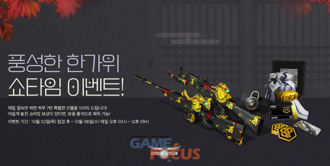‘서든어택’은 10월 4일부터 8일까지 매일 정해진 추석 기념 문구를 게임 내 전체 채팅으로 입력하면 ‘영구제 밀봉’, ‘tripleS 멀티카운트’ 등의 일일 아이템 보상을 선물한다. 이 밖에도, 2일부터 8일까지 정해진 시간마다 게임 접속 상태를 유지하면 매일 7회에 걸쳐 ‘골드 컨테이너’, ‘골드 키카드’, '도안_[C]NA-94 조각' 등의 보상을 지급하고, 2일부터 16일까지 60분 접속으로 출석 조건 충족 시 ‘윈체스터(IS) 풍월 영구제’ 등의 아이템을 제공한다.