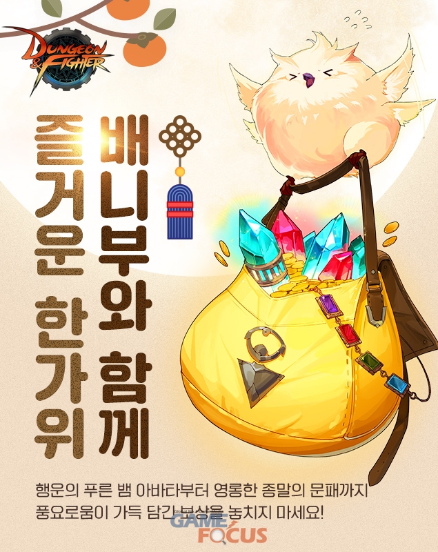 ‘던전앤파이터’는 10월 16일까지 ‘배니부와 함께 즐거운 한가위’ 이벤트를 실시한다. 중천 지역 던전 플레이를 진행하면 ‘행운의 푸른 뱀 아바타 세트 상자’, ‘종말의 계시’, ‘영롱한 종말의 문패’ 등 풍성한 보상을 지급하며, 추석 당일(10월 6일)에는 행복한 한가위를 기원하는 덕담 메시지를 받아볼 수 있다. 또한, 이벤트 기간 동안 ‘최저 마을 이동 속도 +40%’, ‘1~100레벨 스킬 +1’ 등 버닝 버프 혜택을 모든 유저에게 제공한다.