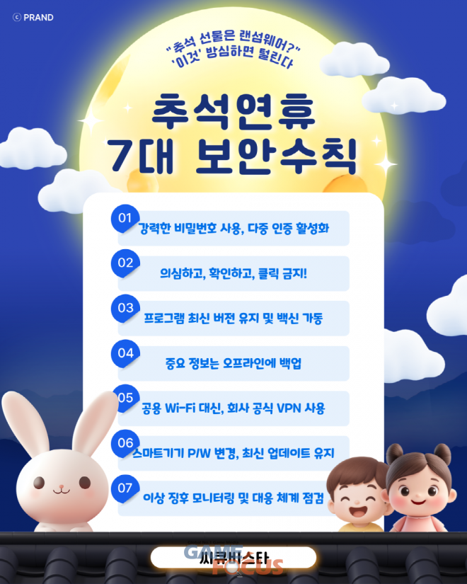 사이버 위협헌팅 보안기업 '씨큐비스타'(대표 전덕조)는 한 순간의 방심으로 재앙을 당하지 않도록 개인과 기업, 공공기관 등이 연휴를 앞두고 반드시 점검하고 실천해야 할 '추석연휴 사이버 보안수칙 7가지'를 발표했다.