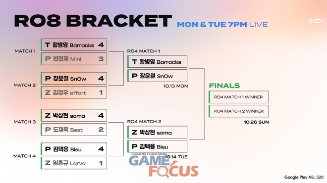 특히 이번 ASL 4강에 진출한 선수들 모두 이번 시즌 첫 우승을 도전하며 16강을 1위로 진출한 실력자들인 만큼 어느 때보다도 박진감 넘치는 멋진 경기력을 보여줄 것으로 예상된다. 4강전은 7전 4선승제로, 양 선수가 맵을 하나씩 선택해 진행된다.