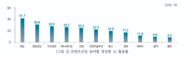 생성형 AI 활용 사업체 503개 중 전사 도입 활용은 25%(126개사), 일부 부서에만 도입 및 활용했다는 응답은 75%(378개사)로 나타났다. 더불어 게임산업은 2025년 상반기 기준으로 41.7%가 생성형 AI를 활용하는 것으로 조사돼, 2위인 방송 영상(30.8%)보다 10% 가량 높은 활용률을 기록했다.