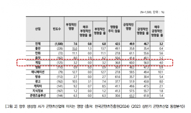 더불어 향후 생성형 AI를 도입했을 경우 콘텐츠 산업에 미칠 영향에 대한 인식 조사에서 게임사 중 60%는 긍정적인 영향을 줄 것으로 전망했다. 부정적인 영향을 줄 것이라고 전망한 게임사는 3.2%에 그쳤다.