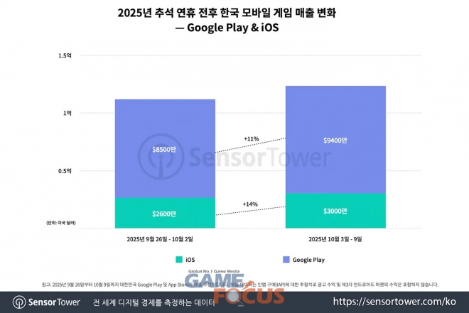 센서타워 앱 퍼포먼스 인사이트 시장 규모 데이터에 따르면, 10월 3일부터 9일까지 구글 플레이와 앱스토어를 합한 매출 추정치는 약 1억 2천만 달러로, 전주 대비 약 12% 증가했다. 스토어 별로 보면 구글 플레이가 11%, iOS가 14%가 증가하며 iOS에서 특히 강한 성장세가 나타났다.