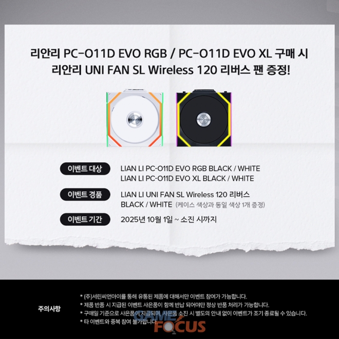 서린씨앤아이(대표: 전덕규)가 리안리(LIAN LI) PC 케이스 구매 고객을 대상으로 쿨링팬을 증정하는 10월 리안리 이벤트를 진행한다. 행사 대상은 PC-O11D EVO RGB와 PC-O11D EVO XL이며, 구매 고객에게는 케이스 색상과 동일한 UNI FAN SL WIRELESS 120 Reverse(블랙/화이트 중 1)가 사은품으로 제공된다.