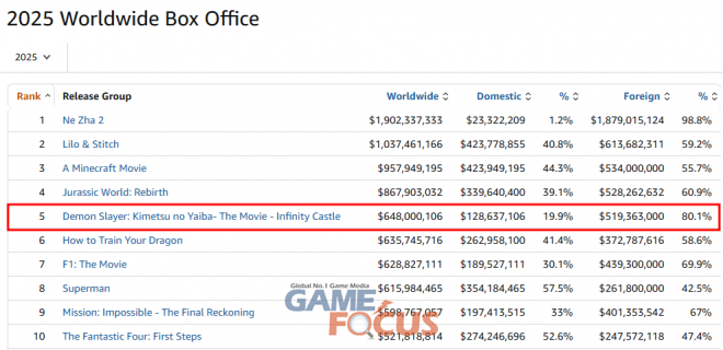 <극장판 귀멸의 칼날: 무한성편>이 누적 관객 수 542만 명을 돌파하며 2025년 전체 박스오피스 2위에 등극했다. 개봉 전부터 올해 최고 사전 예매량을 기록하고, 개봉 이후 올해 가장 빠른 속도로 200만 관객 돌파, 2025년 최고 매출액 달성 등 각종 신기록을 세우며 전무후무한 흥행 신드롬을 이어가고 있다. 올해 화제작 <F1 더 무비>(520만 명)를 제치고 박스오피스 2위에 오른 데 이어, 흥행 1위 <좀비딸>(562만 명)의 기록까지 넘보고 있다.