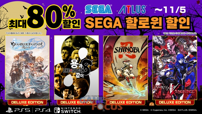 세가퍼블리싱코리아(대표 사이토 고)는 PlayStation™Store 및 닌텐도 e숍에서 판매 중인 일부 PlayStation®5/PlayStation®4/Nintendo Switch 용 타이틀을 기간 한정으로 특별 가격에 판매하는 'SEGA 할로윈 할인'을 개최 중이다.