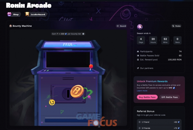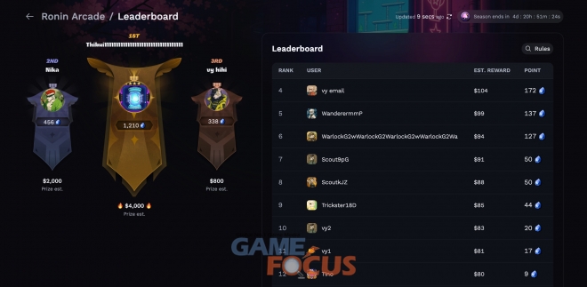 플레이어는 각 게임에서 퀘스트를 수행해 포인트를 획득할 수 있으며, 이를 리더보드(Leaderboard, 순위표) 순위 상승 또는 보상 교환에 사용할 수 있다. 리더보드 상위 250명에게는 최소 45달러 상당의 RON이 지급되고, 1위에게는 4000달러, 2위에게 2000달러, 3위에게 800달러 상당의 RON을 지급할 예정이다.