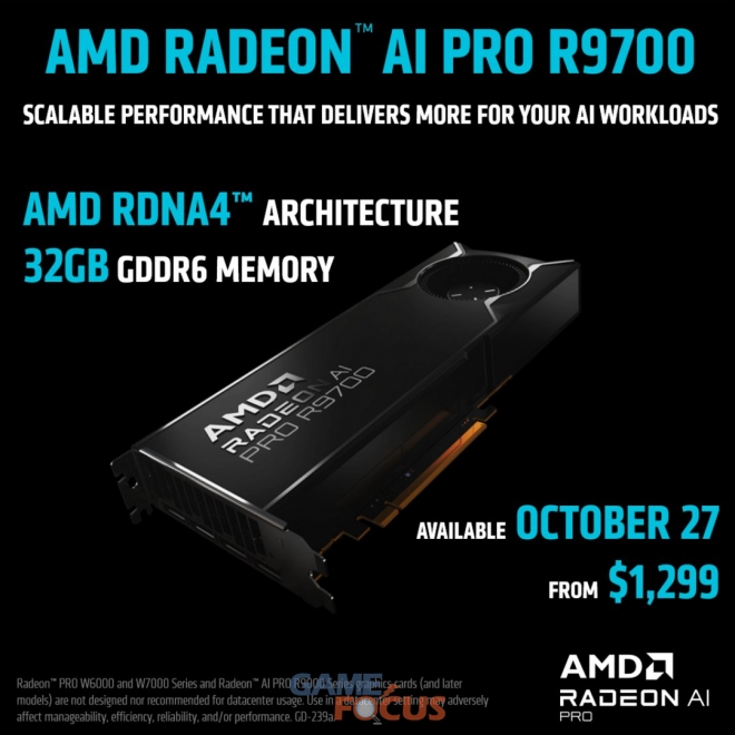 AMD가 새로운 AMD 라데온(Radeon™) AI PRO R9700을 출시한다고 발표했다. 10월 27일 월요일부터 전 세계 소매점을 통해 판매된다. 권장 소비자 가격은 1299달러다.