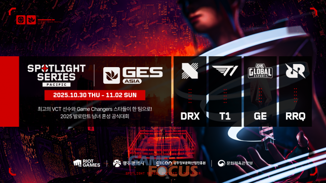 ‘2025 스포트라이트 시리즈 퍼시픽 x GES ASIA’가 오는 10월 30일(목)부터 11월 2일(일)까지 광주 e스포츠경기장에서 개최된다. 이번 대회는 발로란트 퍼시픽 리그를 대표하는 4개 팀, T1, DRX, RRQ, GE(Global Esports)가 참가해 남녀 혼성 팀 구성으로 새로운 경쟁을 펼칠 예정이다.