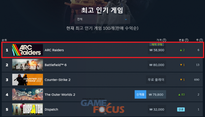 넥슨의 신작 PvPvE 익스트랙션 슈터 '아크 레이더스'가 30일 저녁 출시를 앞두고 있는 가운데, '스팀' 최고 인기 게임(Top Sellers, 판매 수익 순) 글로벌 1위를 달성했다. 특히 국내 기준으로도 6위를 기록하는 등 새로운 익스트랙션 게임을 원하는 이용자들에게 주목 받는 모습이다.