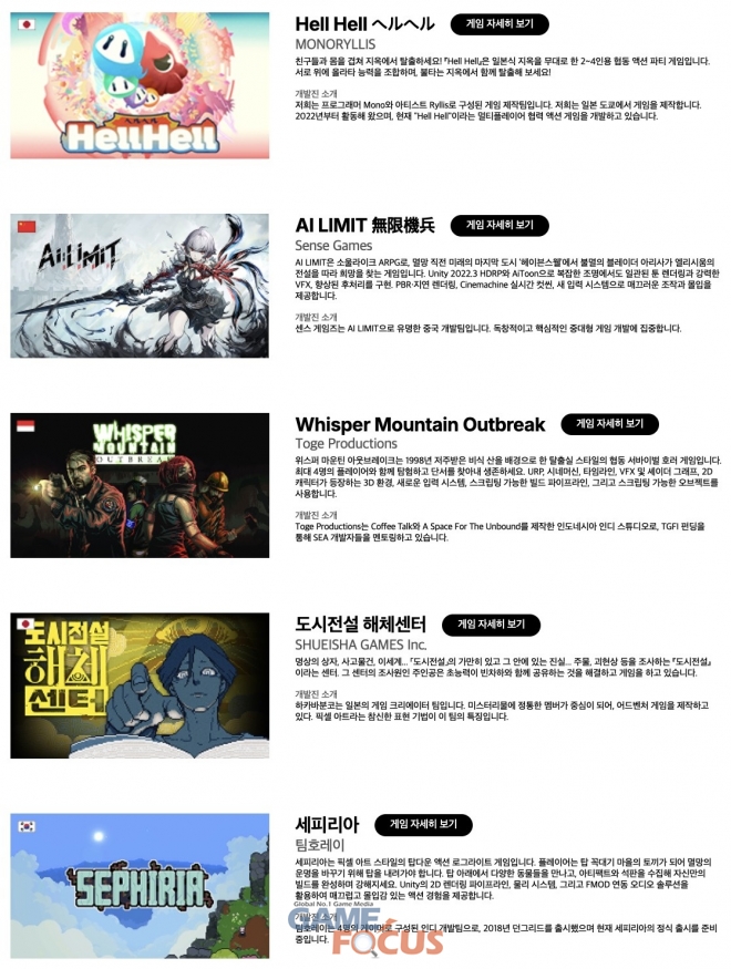 유니티 월드 존에서 만나볼 수 있는 해외 인디 게임은 ▲챈트 오브 세나르(런디스크), ▲인투 더 데드: 아워 다키스트 데이즈(픽폭), ▲코어 키퍼(퍼그스톰), ▲Hell Hell (MONORYLLIS), ▲AI 리미트(센스 게임즈), ▲성세천하: 여제의 탄생 I(뉴 원 스튜디오), ▲위스퍼 마운티 아웃브레이크(토게 프로덕션), ▲웨일드렛츠(웨일드웍스), ▲빅 보이 복싱(SoupMasters), ▲Sea Of Rifts(Out Of Bounds Games), ▲프로젝트 Z: 비욘드 오더(314 아츠 OHG), ▲타이니 북샵(네오루딕) 등 12개다.