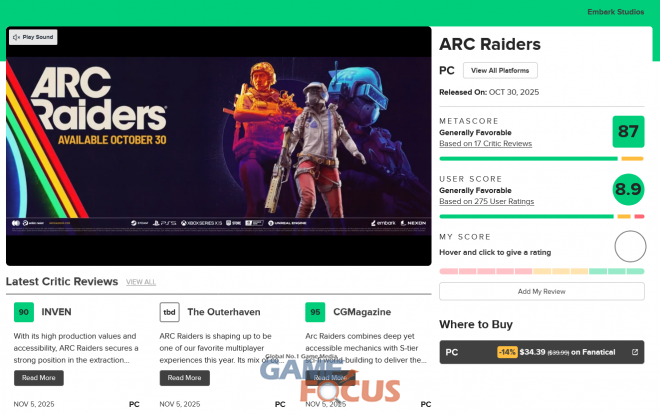 넥슨의 신작 PvPvE 익스트랙션 슈터 게임 '아크 레이더스'가 '스팀' 동시 접속자 35만 명을 기록하며 흥행에 성공한데 이어, 평단에서도 높은 평점을 받으며 게임성을 인정 받았다.