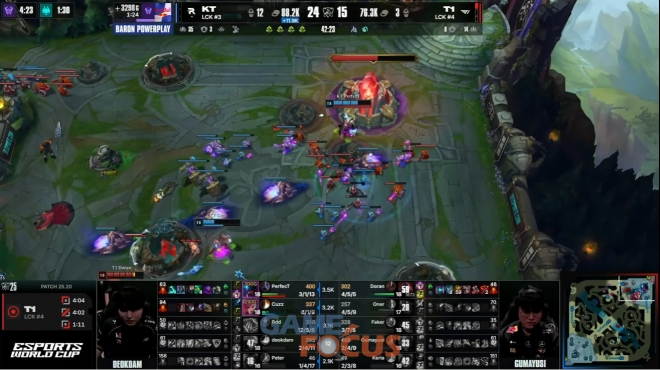 T1은 본인들이 가진 주도권을 바탕으로 오브젝트도 관리하며 초반 게임을 구리려 했으나 중요 순간 마다 ‘Cuzz’의 문도가 벽처럼 T1 선수들을 막았다.
