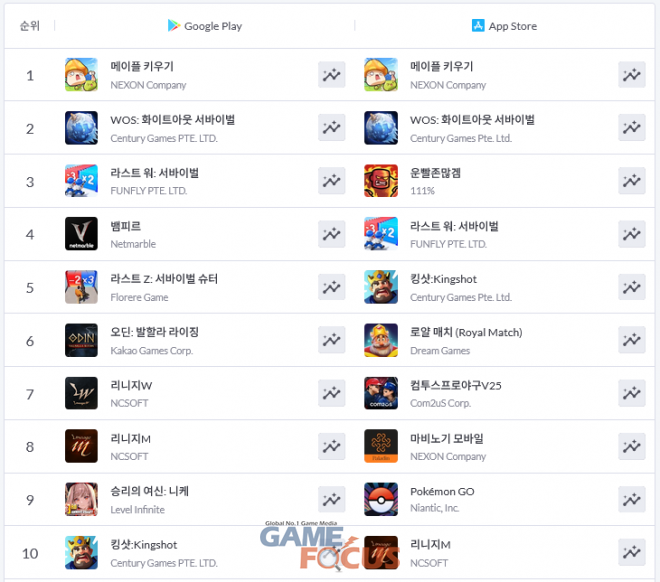 먼저 구글 플레이에서는 '화이트아웃 서바이벌', '라스트 워: 서바이벌', '뱀피르', '라스트 Z: 서바이벌 슈터' 등 기존에 매출 순위가 높았던 게임들을 모두 제치고 넥슨의 '메이플 키우기'가 1위를 차지하면서 흥행 돌풍을 일으켰다.