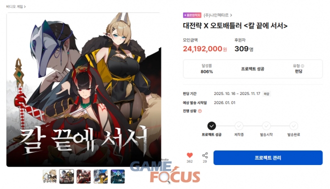 나인헥타르(대표 함기석)는 자사가 개발 중인 신작 ‘칼 끝에 서서’가 지난 10월 16일부터 진행된 텀블벅 펀딩에서 목표 금액의 806%를 초과 달성했다고 20일 밝혔다.