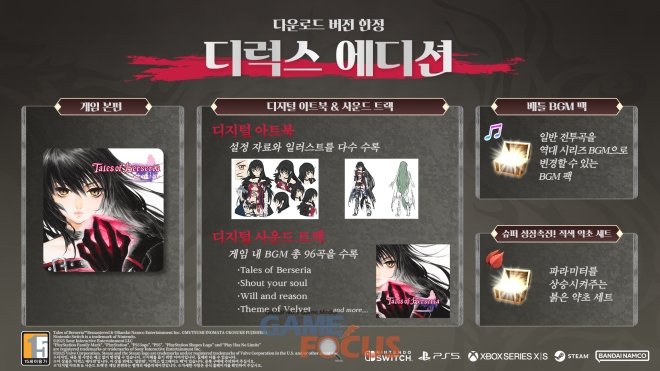 PlayStation®5, Xbox Series X|S, STEAM®용 ‘테일즈 오브 베르세리아 리마스터’(한국어판) 다운로드 버전의 예약을 시작했다. 일반판과 함께 다운로드 버전 한정 ‘디럭스 에디션'을 만나볼 수 있다.