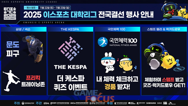 한편 2025 이스포츠 대학리그는 문화체육관광부가 주최하고 한국e스포츠협회, 광주정보문화산업진흥원, 대전정보문화산업진흥원, 부산정보산업진흥원이 공동주관하며, 한국콘텐츠진흥원, 라이엇 게임즈, 넥슨코리아, 삼성전자, 시디즈, 골스튜디오, SK텔레콤이 후원한다.