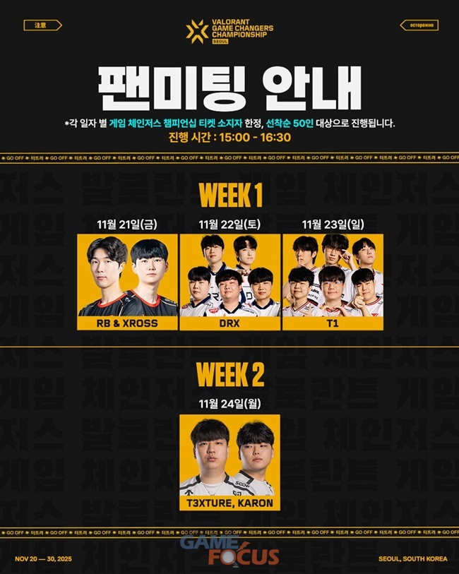 발로란트 챔피언스 투어 퍼시픽 소속 한국 팀인 농심 레드포스, DRX, T1, 젠지 이스포츠가 게임 체인저스 챔피언십 서울 기간 중 현장을 찾을 예정이다. 21일 농심 레드포스의 'Rb' 구상민, 'Xross' 정환을 시작으로 22일 DRX 발로란트 선수단 전원, 23일 T1 발로란트 선수단 전원, 24일 젠지 't3xture' 김나라, 'Karon' 김원태가 발파크를 찾아 팬미팅을 진행한다. 팬미팅 세부 일정 및 참여 방식은 각 팀 공식 소셜 네트워크 채널과 발로란트 챔피언스 투어 공식 소셜 채널에서 확인할 수 있다.