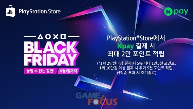 PS Store는 Npay 결제 서비스 론칭과 PlayStation의 'Black Friday 프로모션'을 기념해, 12월 1일까지 PS Store에서 Npay로 결제 시 최대 2만 포인트를 증정하는 특별 프로모션을 진행한다. 해당 프로모션은 실명인증 기준 1인 1회 참여 가능하며, 선착순으로 진행돼 조기 종료될 수 있다.