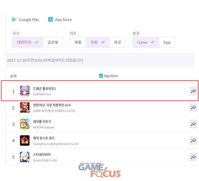 ‘드래곤 플라이트2’는 출시 당일 오후, 서비스 시작 약 6시간 만에 애플 앱스토어 무료 게임 인기 순위 1위에 이름을 올렸으며 현재까지 그 순위를 유지하고 있다.