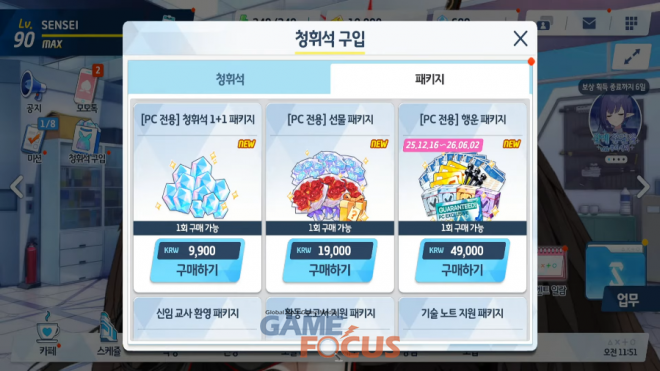12월 16일 점검 이후에는 12종의 신규 패키지도 추가된다. 이중에서도 3성 선택 모집 패키지는 그동안 없어서 아쉬웠던 학생을 데려올 수 있는 절호의 기회로, 많은 '선생님'들이 구매할 것으로 예상된다. 이와 함께 다양한 보상과 특별 가구 및 칭호 그리고 청휘석까지 얻을 수 있는 '배틀패스' 상품이 추가된다. 더불어 PC '스팀' 클라이언트에서만 구매 가능한 패키지 3종도 출시된다.