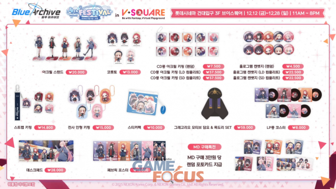마지막으로 아이파크몰 용산점 도파민 스테이션에 위치한 공식 테마 카페 '카페 메모리얼'이 새로이 리뉴얼된다. '아코', '이오리', '아스나', '카린' 등 4명의 학생들이 카페 아르바이트생으로 등장하며, 신규 일러스트를 활용한 식음료들과 머천다이즈가 준비될 예정이다. 또 내년 1월부터는 매달 생일을 맞이한 학생을 콘셉트로 한 음료 및 굿즈를 추가하고, 현장을 방문해서 직접 생일 축하 메시지를 남길 수 있는 참여 공간도 마련한다.