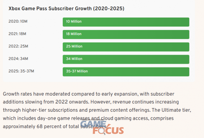 마이크로소프트 Xbox Game Pass의 성장율은 다소 완만해졌지만 매출 구조는 지속적으로 증가하고 있는 것으로 나타났다. 다양한 시장조사 업체에서 조사한 Xbox Game Pass 서비스 구독자는 약 3500만 명~3700만 명 수준으로 지난해 3400만 명 대비 100만~300만 명 수준으로 증가율이 떨어졌지만 상위 구독자, 즉 출시 당일 게임을 즐길 수 있고 클라우드 게임 이용을 포함하는 최상위 구독 서비스인 얼티밋 티어의 구독율은 전체 유저의 약 68%에 달하는 것으로 분석했다. 이는 약 38%로 확인된 경쟁사의 최상위 구독자 수 비율의 약 두 배에 달하는 수치다. 특히 지난해 구독 서비스의 가격 인상에도 불구하고 콘솔 구독자의 약 80%가 Ultimate 티어를 유지한 것으로 나타났는데 이는 독점 출시 및 DAY1 출시 기능이 프리미엄 가격에 걸맞는 상품으로 자리잡았다는 것을 의미한다.