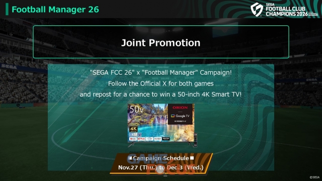『Football Manager 26』과 『SEGA FOOTBALL CLUB CHAMPIONS 2026』 각각의 공식 SNS를 팔로우한 후 이벤트 게시글을 공유하면 추첨을 통해 '55인치 4k 스마트 TV'를 선물하는 더블 팔로우 & 공유 이벤트를 개최 중이다.