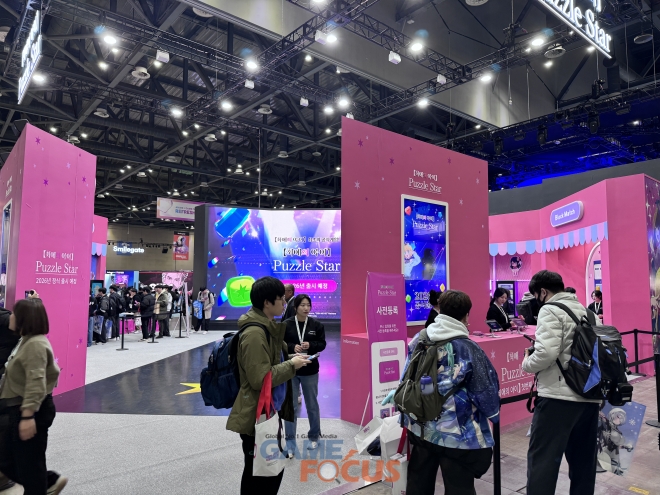 '【최애의 아이】Puzzle Star' 부스 공간에서는 미니 게임을 즐기고 선물을 받을 수 있는 체험형으로 꾸며졌다. 주요 등장 인물들로 구성된 대형 출시 예고 일러스트와 파스텔톤의 분홍색 테마가 눈길을 사로잡으며 출시에 대한 기대감을 끌어올렸다.