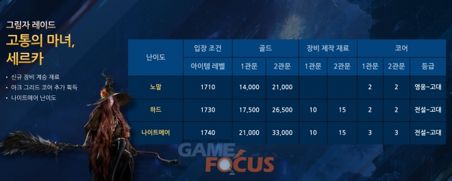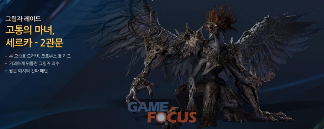 1월 7일에 업데이트 되는 첫 그림자 레이드는 ‘고통의 마녀, 세르카’로 슈사이어에 있는 시리우스 교단에서 전투가 진행된다. 4인 파티, 2개 관문으로 구성된다. 1관문은 10가지 고문도구를 활용해 가학적인 행동을 즐기는 잔혹하고 아름다운 마녀의 모습으로 전투가 진행되며 2관문은 세르카의 몸 속에 숨어지내던 태초부터 존재한 자 ‘코르부스 툴 라크’와의 전투로 이어진다. 기존의 인간형 보스와는 다른 피를 이용한 독특한 전투 방식을 가지고 있다.