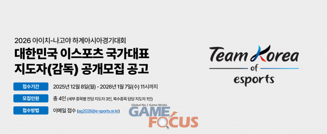 한국e스포츠협회(이하 협회)가 2026 아이치-나고야 하계 아시아경기대회(이하 아시안게임) 이스포츠 국가대표 지도자를 공개 모집한다고 8일(월) 밝혔다.