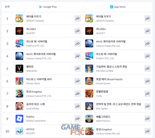 먼저 구글 플레이에서는 '메이플 키우기'가 1위 자리를 수성하며 출시 이후부터 현재까지 독주가 계속되고 있다. '버섯커 키우기' 등 극히 일부 사례를 제외하면 '메이플 키우기'의 이러한 흥행은 방치형 RPG로서는 이례적인 만큼 당분간 이러한 흥행세가 이어질 것으로 전망된다.
