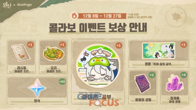 3일 연속 학습 퀘스트를 완료한 이용자는 2025년 12월 30일 23:59:59(UTC)까지 듀오링고 애플리케이션의 ‘상점’ 탭에서 리딤 코드를 수령할 수 있으며, 2026년 1월 31일 15:59:59(UTC)까지 원신 인게임 보상으로 교환할 수 있다.