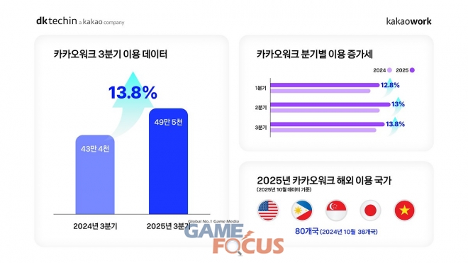 이번 데이터에 따르면 카카오워크의 올해 3분기(2025.07~2025.09)의 누적 이용자 수는 49만 5천여 명으로, 전년 대비 약 13.8% 상승했다. 올해 1분기부터 지난해를 뛰어넘는 이용자 수를 기록하며 지속적인 성장세를 보이고 있으며, 4분기(2025.10~2025.12)의 경우 10, 11월 두 달간의 이용량이 이미 지난해 4분기 수치를 상회하면서 역대급 분기 성과를 달성할 것으로 전망된다.