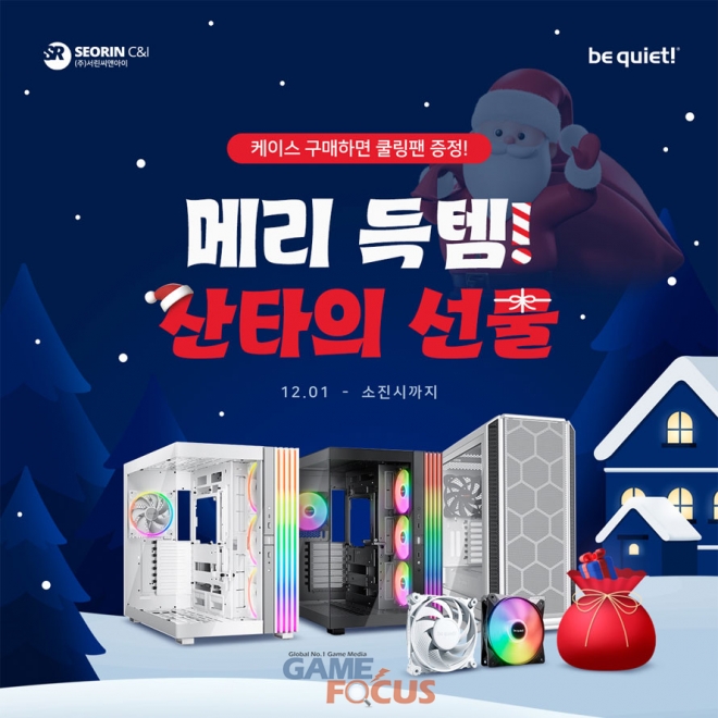 서린씨앤아이(대표: 전덕규)가 독일 프리미엄 PC 하드웨어 브랜드 be quiet!와 함께 자사 케이스 구매 고객을 대상으로 쿨링팬을 증정하는 메리 득템 산타의 선물 프로모션을 진행한다고 밝혔다.